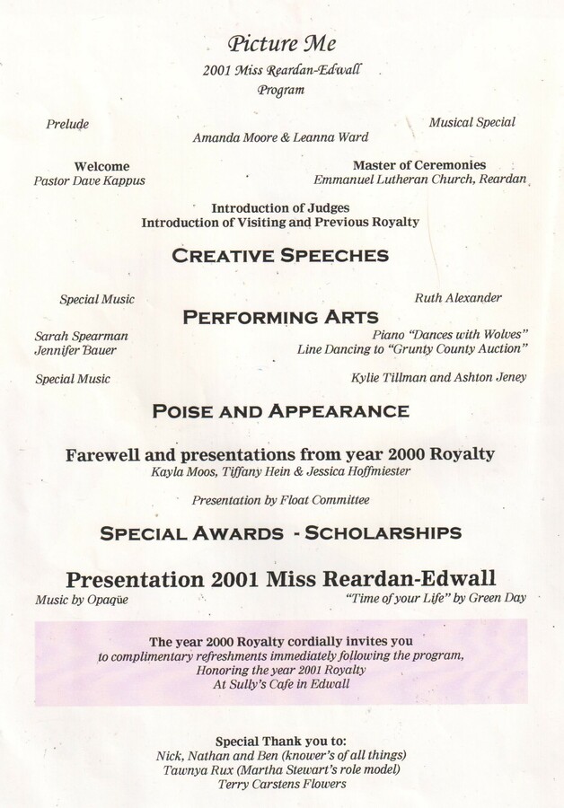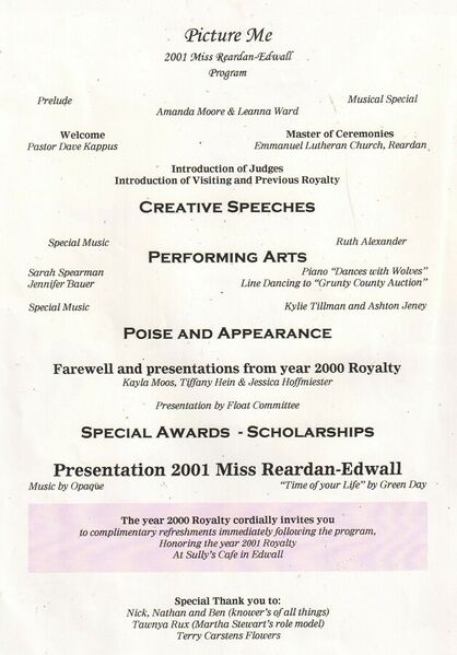 This page is from a scrapbook held by the Reardan Memorial Library about the Reardan Royalty. 2001 royalty 006