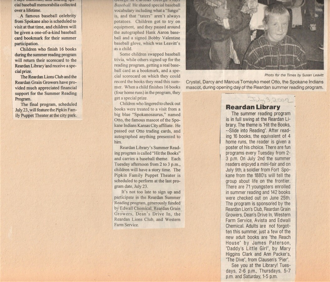 from Memorial Library scrapbook held by the Reardan Memorial Library.