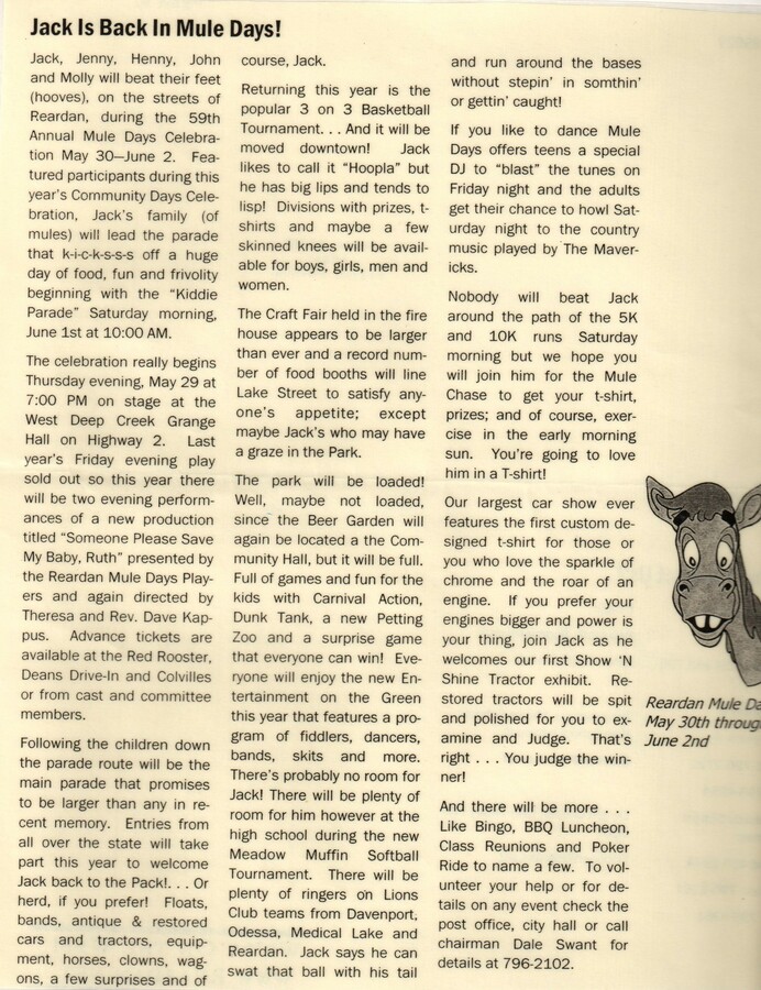 This page is from a scrapbook held by the Reardan Memorial Library about the Reardan Mule Days. 001