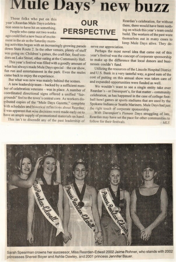 This page is from a scrapbook held by the Reardan Memorial Library about the Reardan Mule Days. 002