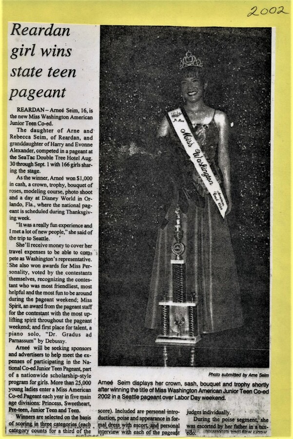 This page is from a scrapbook held by the Reardan Memorial Library about Reardan Royalty. 2002 royalty 003