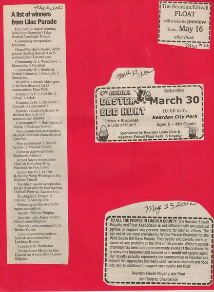 This page is from a scrapbook held by the Reardan Memorial Library about Reardan Royalty. 2002 royalty 007