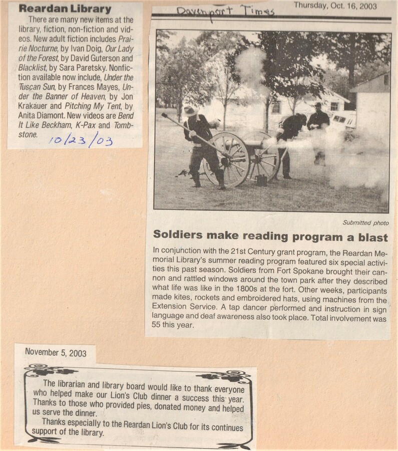 from Memorial Library scrapbook held by the Reardan Memorial Library.