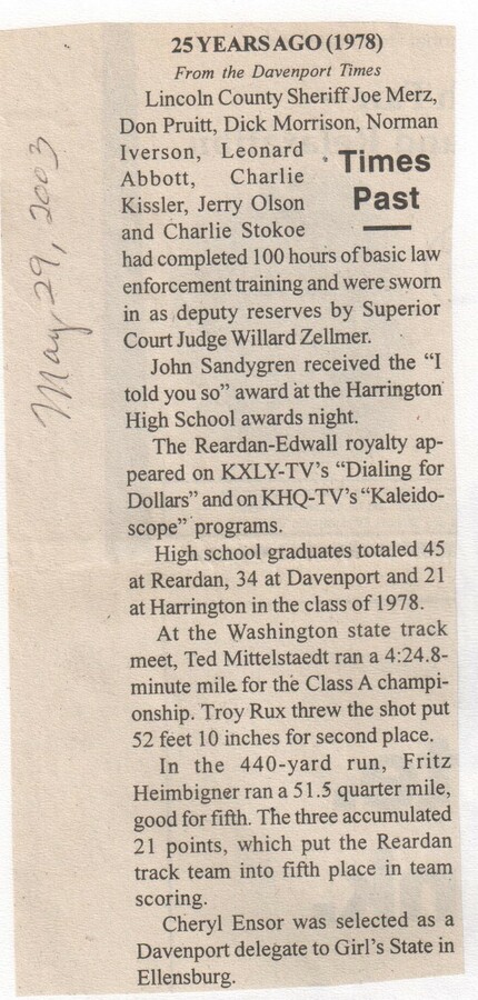This page is from a scrapbook held by the Reardan Memorial Library about Reardan Royalty.