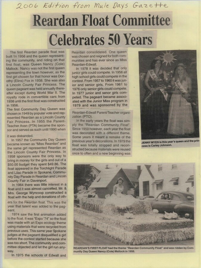 This page is from a scrapbook held by the Reardan Memorial Library about the Reardan Royalty. floats clipping 2006