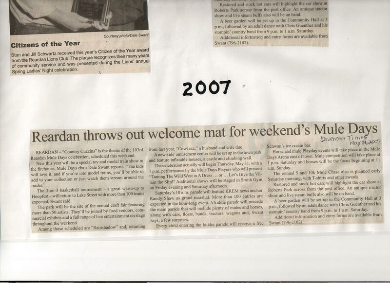 This page is from a scrapbook held by the Reardan Memorial Library about the Reardan Mule Days. 002