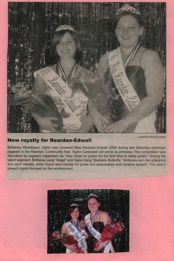 This page is from a scrapbook held by the Reardan Memorial Library about the Reardan Royalty. 2008 royalty 010
