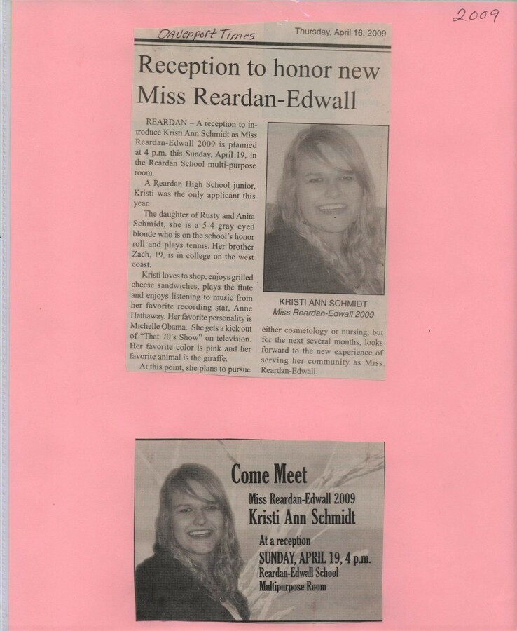 This page is from a scrapbook held by the Reardan Memorial Library about the Reardan Royalty. 2009 royalty 001