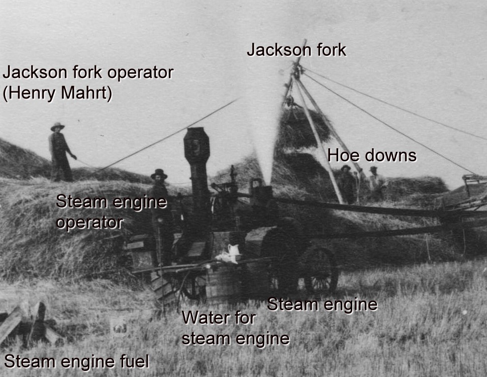 Photograph of Mahrt threshing outfit left hand side. Photograph likely to be early 1900s and may be by Otto Mahrt. Photograph from the Carlson family photograph collection.