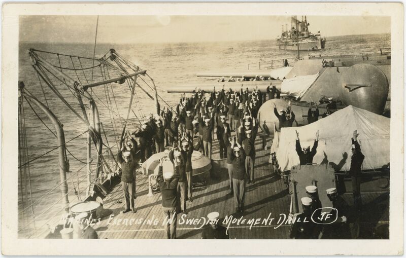 Marines exercising in Swedish movement drill (JF).