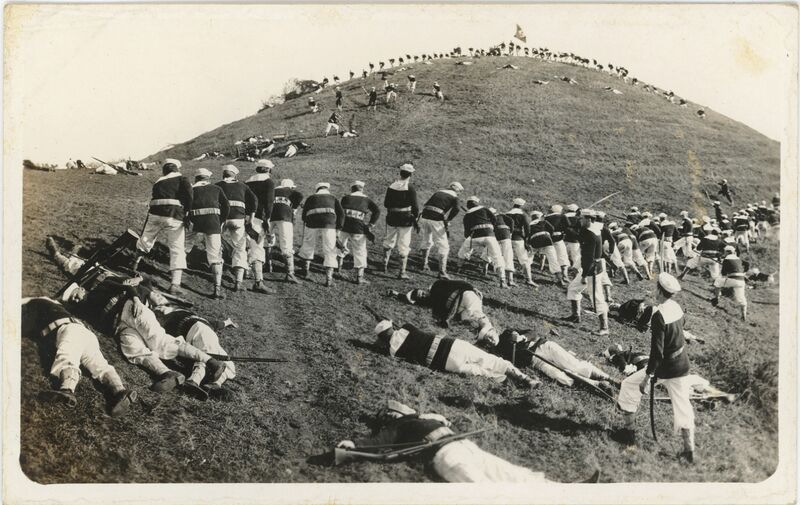 Sailors on hill (identified by Google as Army Point goat Island near Yerba Buena Island with Cadets in sham battle 12 Nov 1912)