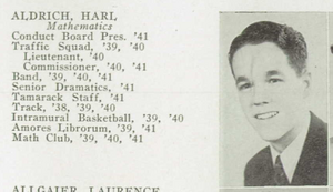 Harl Aldridge, Jr., grew up in Reardan as the son of the superintendent of schools, Harl Aldrich, Sr., as did his older sister, Elise and brother, Lynn. While at Reardan he took some of his first piano lessons and all three of the Aldrich children played piano competitively. Elise graduated from Reardan in 1933. Harl and Lynn continued with their piano studies and competed against Roger Mahrt. Lynn graduated from North Central High school in 1939 and Harl followed in 1941 (the same class as Joe E. Mann). Harl then went to the University of Idaho. His studies were interrupted by World War II and he joined the Navy V5 flight training program..