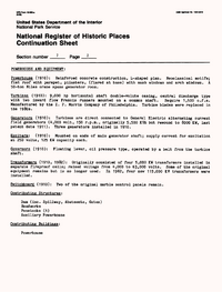 Transformers (1910, 1982): Originally consisted of four 5,000 KW transformers installed in separate fireproof cells; raised voltage from 4,000 to 63,000 volts. Some of the original equipment remains but is no longer used. In 1982, four new 115,000 KV transformers were installed.
