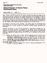 Powerhouse (1910): Reinforced concrete construction, L-shaped plan. Neoclassical motifs; flat roof with parapet, pilasters, (flared at base) with sash windows and arch windows. A 50-ton Niles crane spans generator room.