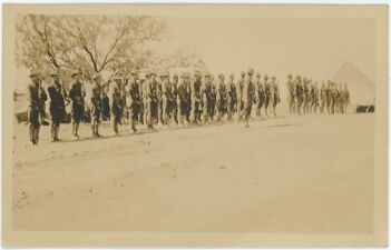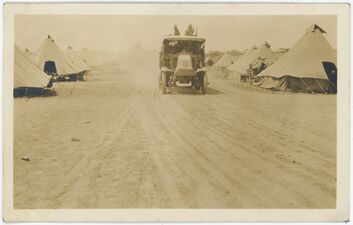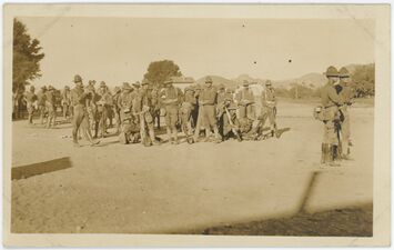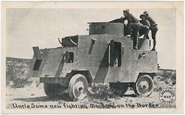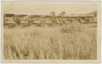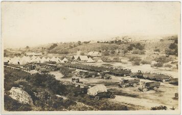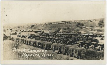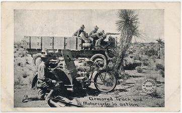 After Pancho Villa invaded the town of Columbus, New Mexico, General Pershing organized a force to cross the border and capture Pancho Villa. Although this lasted between March 14, 1916 and February 7, 1917, Pancho Villa was never captured. This effort is now officially called the Mexican Expedition. The following are postcards believed to have been collected by Joseph Carlson when stationed as a cook at Fort Huachuca, New Mexico during World War I. They show life on both sides of the border including both horse powered military and the introduction of trucks and tanks into modern warfare.