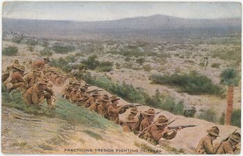 "Practicing trench fighting in Texas; published by American Colortype Co. Chicago.; American Colortype Co. Chicago."