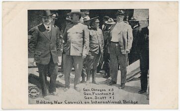 "Generals Obegon, Funston and Scott holdin War Council on Internation Bridge; Kavanaugh's War postals; Kavanaugh's War postals"