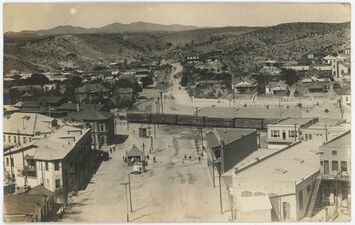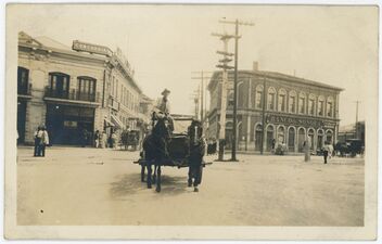 "Mexican street scene, Banco De Sonora, Mexican Cigars, Concordia Hotel, street vendor, custom house builder, rail cars"